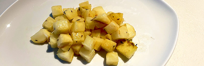 Otteniamo dei cubetti di sedano rapa morbidi, profumati e leggermente caramellati, con un aroma delicato che ricorda una via di mezzo tra patata e finocchio, esaltato dal timo.